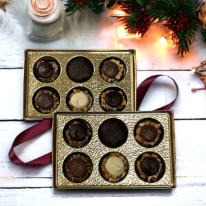 Hand-made with our creamy caramel poured over fresh and delicious nuts then covered in our premium milk, dark and white chocolate. They are available in either a 6pc or 12pc gift box.