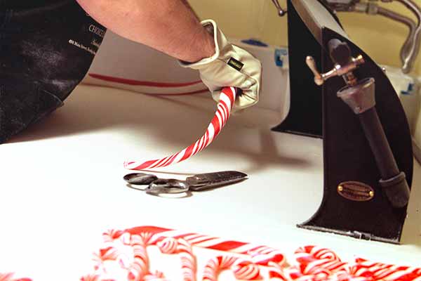 A great question and one I am asked quite often. Over the years the answer has varied. In my teenage years when I was just learning the craft I would more than likely answer that making hard candies was my favorite or perhaps a certain chocolate. Many years later however, my answer is concrete: candy canes. In order to shed some light on the process of making a candy cane we need to start with some basic facts. Our candy canes are made using a time honored recipe and made completely by hand. The process requires swift hands, a warm kitchen and complete attention to the details.